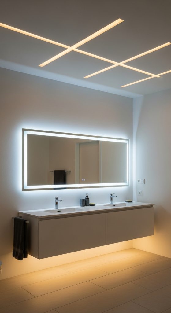 LED strip lighting is versatile and energy-efficient, making it perfect for bathrooms. Use it under vanities, along the edges of mirrors, or beneath floating shelves to create a soft, ambient glow. LED strips can also be installed along the floor or behind crown molding to highlight architectural features. They are especially effective in small bathrooms, as they add depth and dimension without overwhelming the space.