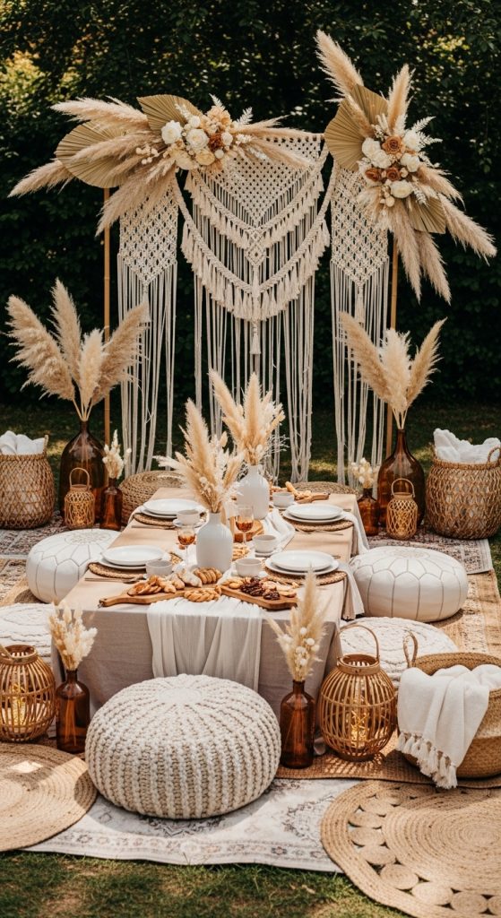 A boho-inspired Baby in Bloom theme combines earthy colors, dried florals, and relaxed textures. Use macramé backdrops, pampas grass, neutral color palettes, and low seating for a cozy, laid-back vibe. This theme is perfect for parents who love a modern, free-spirited aesthetic with a natural twist.
