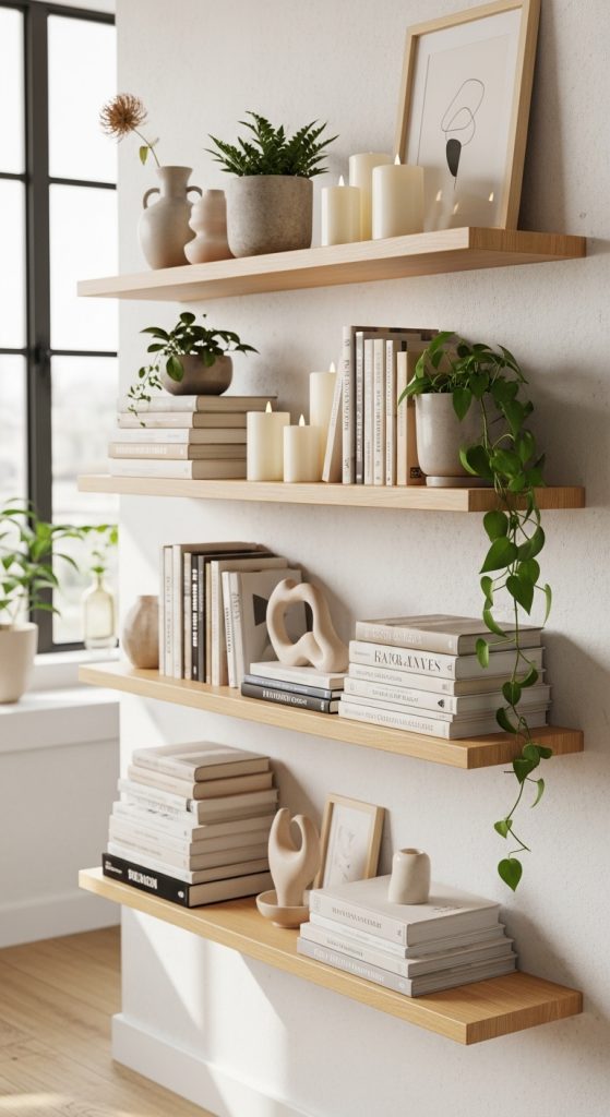 Wall-mounted shelves offer a perfect combination of décor and practicality. Floating shelves, wooden ledges, or metal racks can be styled with books, plants, candles, and decorative accents. This idea works especially well in small spaces where floor area is limited. The styling can be changed seasonally, keeping the décor fresh and flexible.