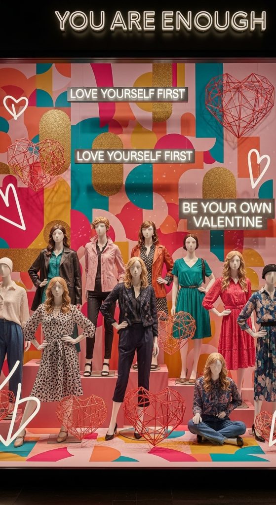 Modern Valentine’s displays don’t have to focus solely on romantic couples. A self-love or friendship-themed window display celebrates confidence, individuality, and meaningful connections. Use empowering quotes, bold colors, and inclusive visuals. This idea resonates strongly with younger audiences and broadens the appeal of Valentine’s Day beyond traditional romance.