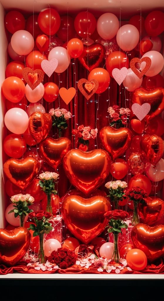 Nothing says Valentine’s Day quite like red and pink. This classic theme never goes out of style and instantly communicates love, passion, and warmth. Use layered shades of red, blush, and soft pink through fabrics, balloons, ribbons, and props. Heart shapes, roses, and romantic typography work beautifully here. Add depth by mixing matte and glossy finishes, or incorporate soft lighting to create a dreamy glow. This display is perfect for stores that want a universally recognizable Valentine’s aesthetic.