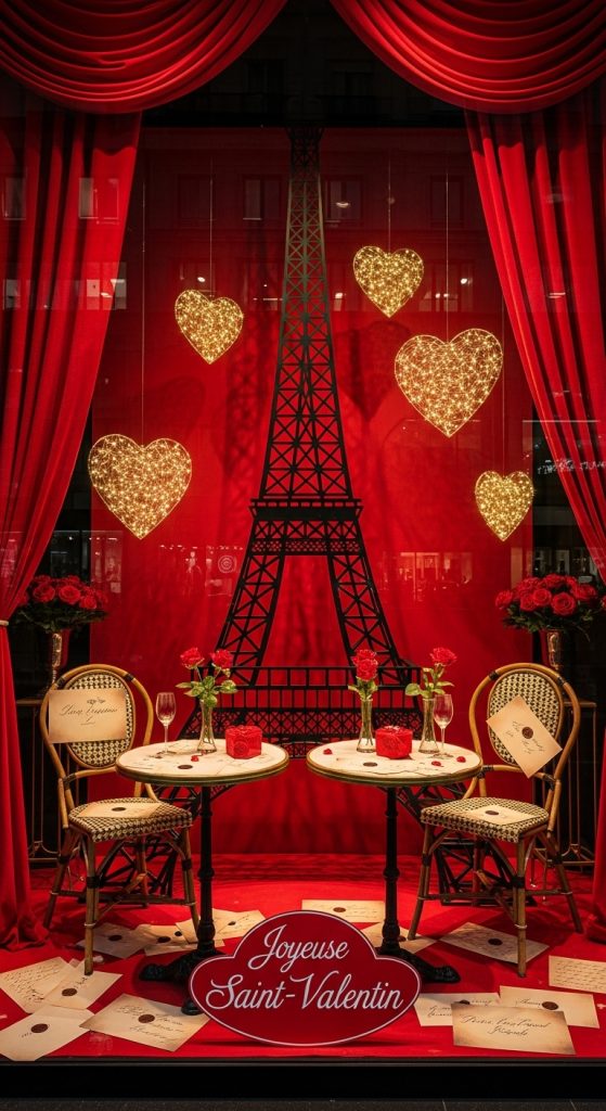Inspired by the city of love, a Paris-themed window display adds elegance and charm. Think Eiffel Tower silhouettes, café chairs, handwritten love letters, and vintage suitcases. Neutral tones like cream, black, and soft red make the display feel sophisticated rather than overly commercial. This idea works especially well for fashion boutiques, bookstores, and lifestyle brands aiming for a romantic yet refined look.
