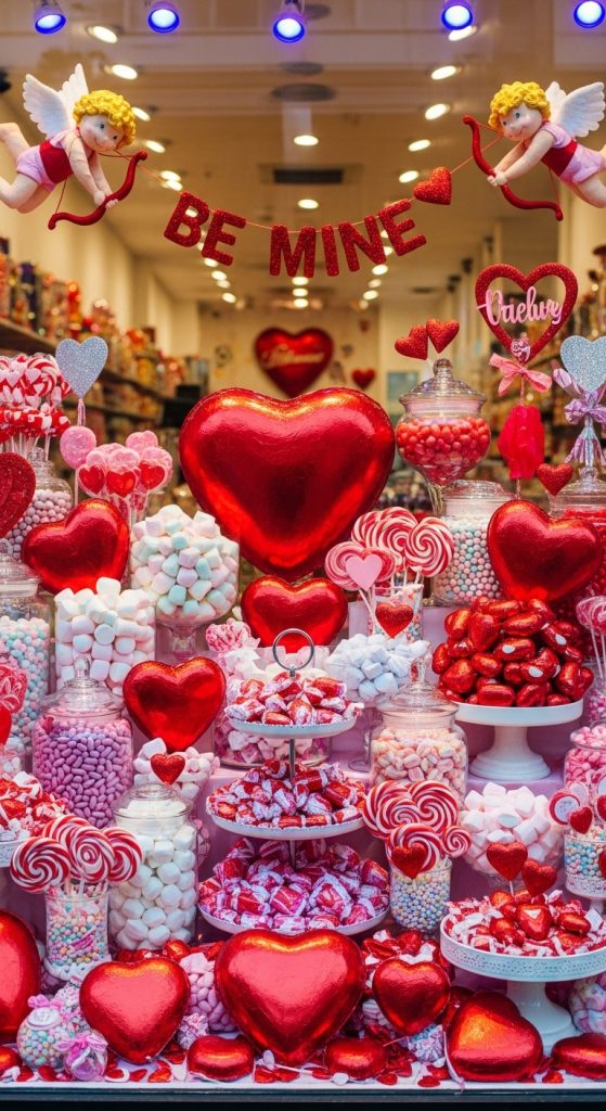 Valentine’s Day is also about indulgence, making a candy-inspired window display playful and eye-catching. Think oversized chocolates, heart-shaped candies, lollipops, and pastel props. This concept works particularly well for bakeries, cafés, gift shops, and family-friendly brands. Bright colors and fun shapes create instant joy and nostalgia, encouraging impulse visits.