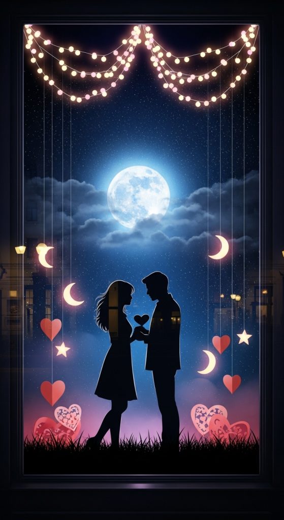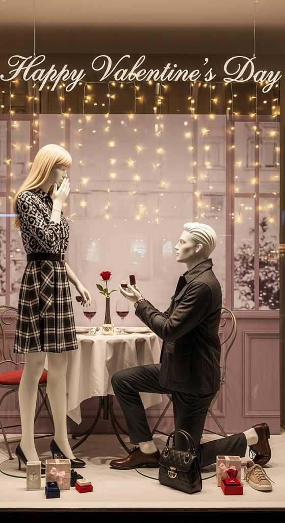 A more dramatic and immersive approach is a nighttime romance theme. Use dark backdrops like navy or deep plum, twinkling fairy lights, star motifs, and moon shapes. Add silhouettes of couples or softly lit mannequins to suggest intimacy and connection. This display feels cinematic and emotional, making it perfect for high-end fashion or jewelry stores.