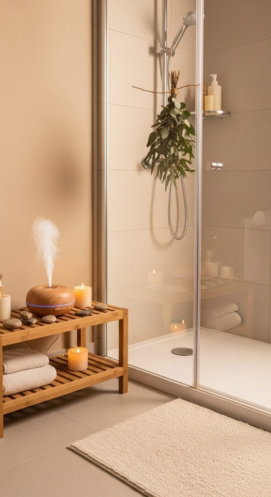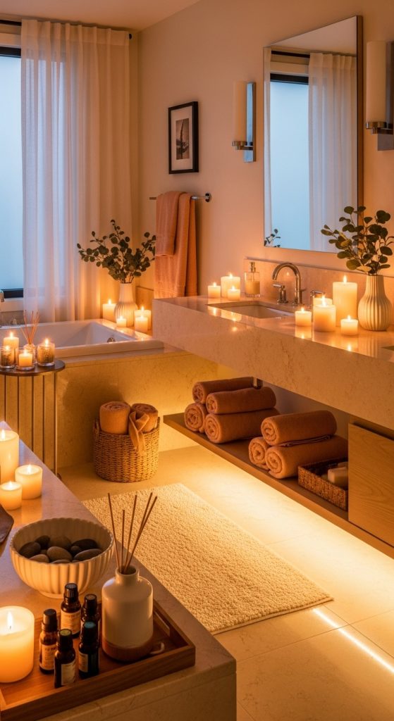 Scent is essential in a spa bathroom. Essential oil diffusers, scented candles, or eucalyptus bundles in the shower create a sensory escape. Popular spa scents include lavender, eucalyptus, sandalwood, and chamomile. These aromas promote relaxation and enhance the overall experience.