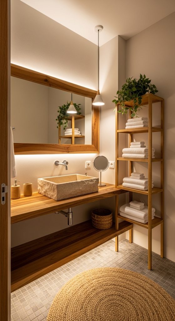 Incorporating natural elements instantly elevates a bathroom into spa territory. Wood accents, bamboo shelves, stone sinks, and pebble flooring bring warmth and a grounding effect. Even small additions—like a wooden bath tray or rattan storage basket—can make the space feel connected to nature.