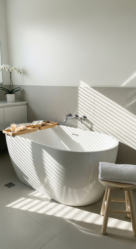 If space allows, a small soaking tub can become the centerpiece of your mini spa bathroom. Compact freestanding tubs or Japanese-style soaking tubs are designed specifically for smaller spaces. Their deep design allows for full relaxation without requiring a large footprint.