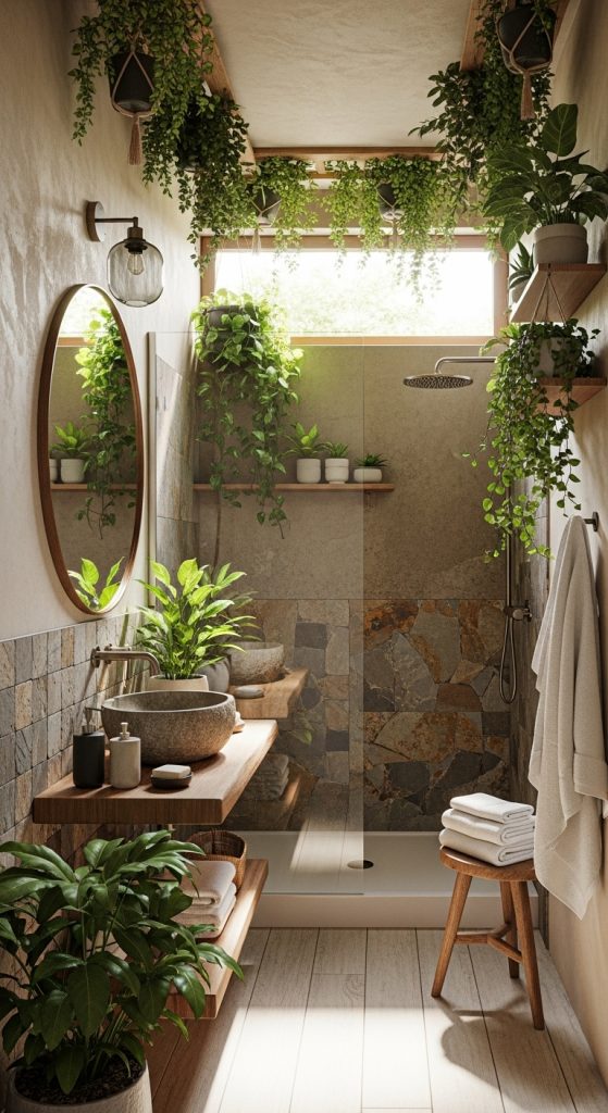 Plants are a powerful spa element. They purify the air and add life to a small space. Choose humidity-loving plants like ferns, peace lilies, snake plants, or pothos. Even a single plant on a shelf or hanging near the shower can refresh the entire bathroom.