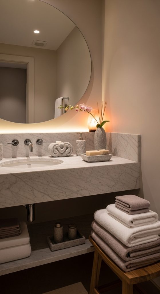 Stone and marble instantly signal luxury. Even small touches—such as a marble countertop, stone soap dispenser, or textured tiles—can elevate the bathroom’s aesthetic. Balance these materials with warm tones and soft lighting to avoid a cold look.