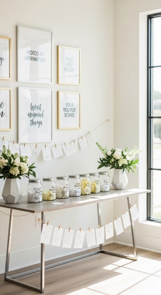 This appreciation shower idea centers on positive words and encouragement. Set up affirmation stations where guests write compliments, motivational messages, or personal notes. These can be placed in envelopes, jars, or framed cards for the honoree to read later.