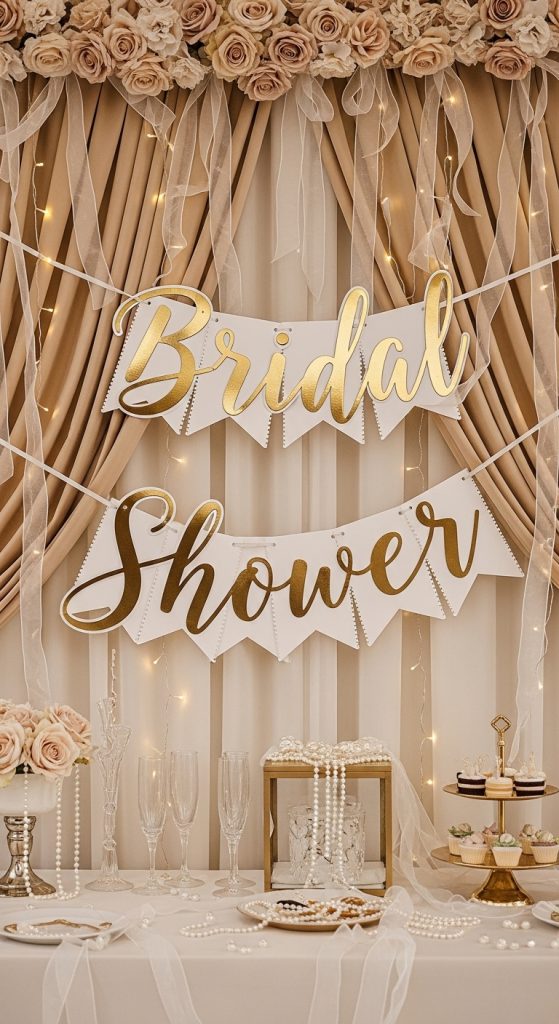 A personalized banner featuring the bride’s name or the couple’s future last name always feels special. Custom banners can include favorite colors, meaningful quotes, wedding dates, or engagement details.