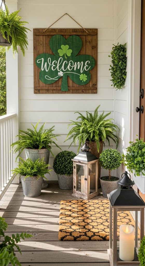 Lanterns bring warmth and coziness to a porch, especially when styled with St. Patrick’s Day accents. Place a few lanterns of different heights near the door or on porch steps. Inside the lanterns, add green candles, gold beads, mini shamrocks, or fairy lights.