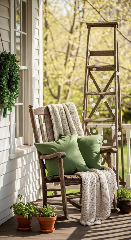 If you prefer subtle seasonal décor, a vintage farmhouse look is perfect. Use neutral colors mixed with soft greens, rustic wood, and simple shamrock accents. Add a rocking chair with a cozy green blanket and a pillow that says “Lucky.”