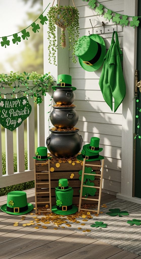 Create a playful scene by dedicating a small corner of your porch to a leprechaun theme. Use figurines, small ladders, tiny pots of gold, and green hats to tell a whimsical story.