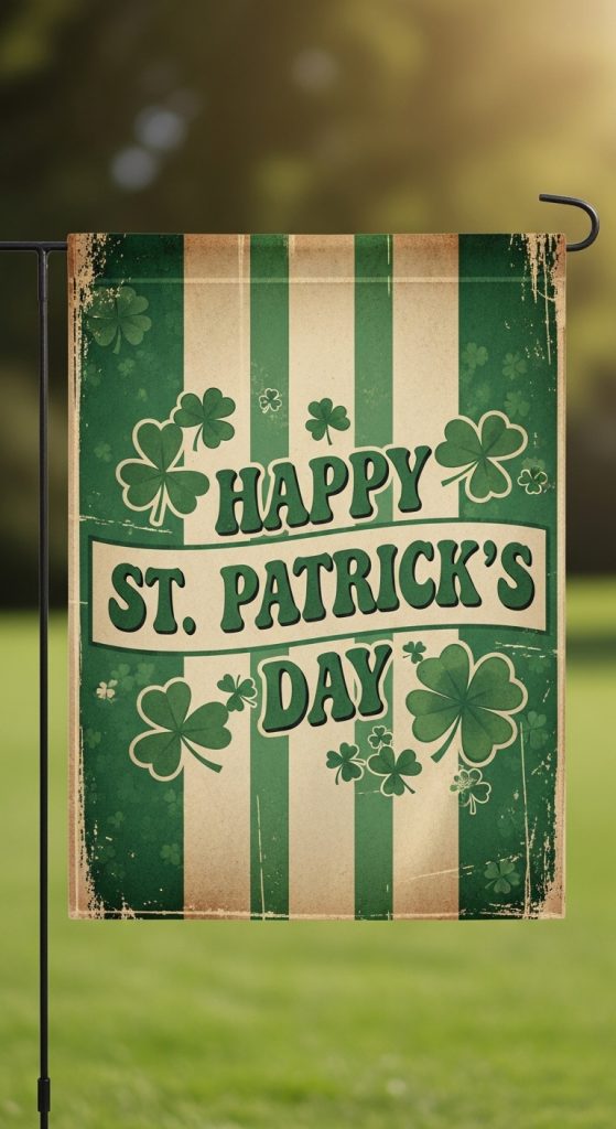 Vintage-inspired decorations have become very popular, and they work wonderfully for holiday décor. A vintage St. Patrick’s Day yard flag might feature distressed textures, retro typography, and old-fashioned illustrations of shamrocks or leprechauns.