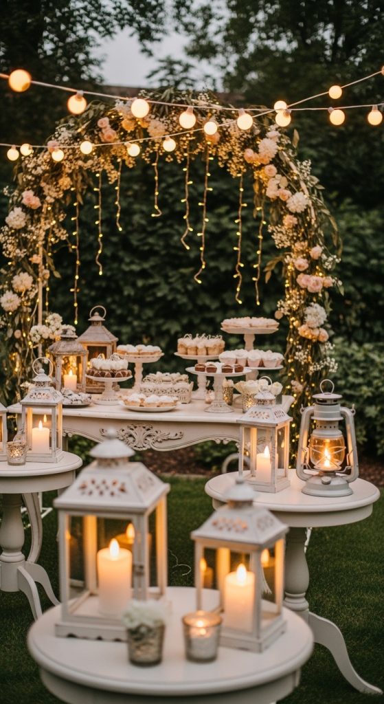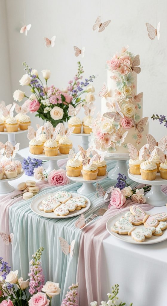 You can also add a decorative backdrop with butterfly cutouts, flowers, and soft draping to make the dessert table photo-ready.