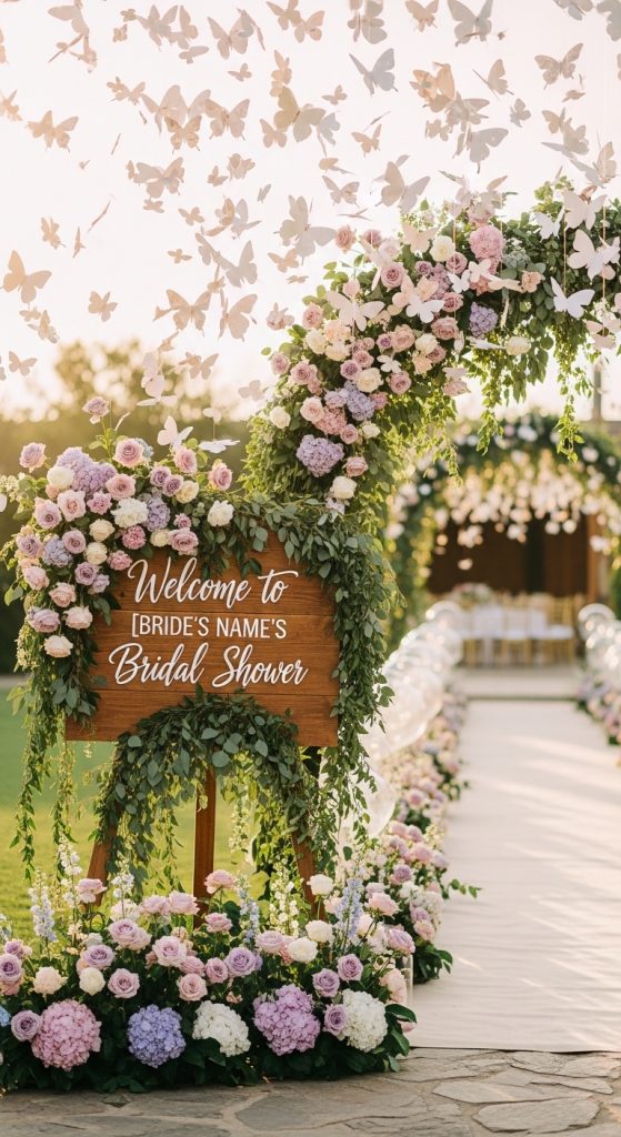 Set the tone right from the entrance by creating a magical butterfly garden welcome area. Use floral arches decorated with pastel flowers, greenery, and delicate butterfly accents. A welcome sign that reads “He Gives Me Butterflies” instantly introduces the theme.