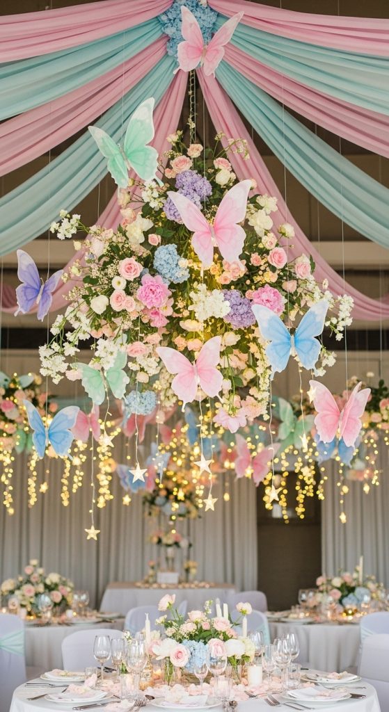One of the most magical décor ideas is creating floating butterflies around the venue. Use transparent threads to hang butterflies from ceilings, chandeliers, tree branches, or arches.