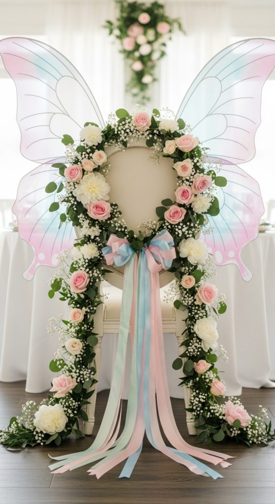 Decorate the bride’s chair with large butterfly wings or a floral butterfly arrangement. You can also tie ribbons, flowers, and small butterfly ornaments to guest chairs.