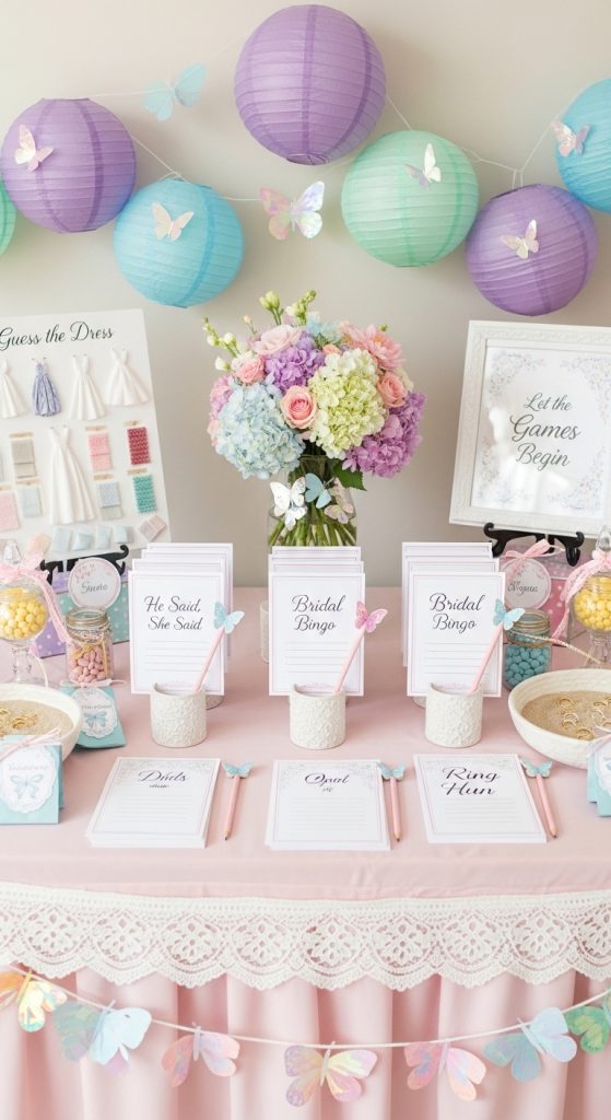 A themed dessert table can become the highlight of the bridal shower. Decorate it with cupcakes topped with edible butterflies, macarons in pastel shades, butterfly cookies, and a cake featuring delicate wings or floral details.