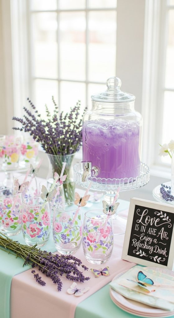 Decorate glasses with butterfly drink charms, floral straws, and edible flower ice cubes. A sign saying “Love is in the Air” or “Sip Sip Hooray” adds a playful touch.