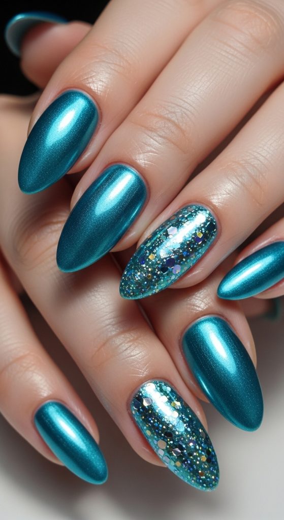 This design blends chrome powder with chunky glitter and holographic flakes. The result is a frosted, icy sparkle that looks stunning in both sunlight and evening lighting.