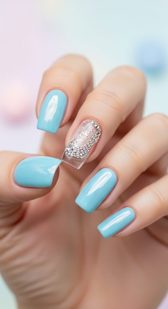 Inspired by the legendary glass slipper, this nail design combines sheer polish with silver chrome accents. Most nails feature a soft baby blue chrome, while one or two accent nails are designed with transparent polish and chrome outlines.
