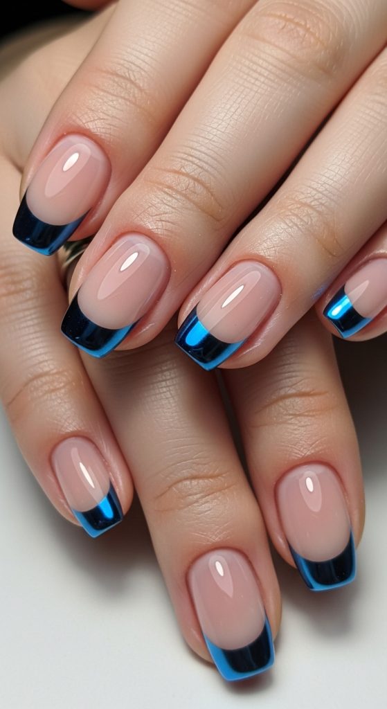 A modern twist on a classic French manicure, this design swaps traditional white tips for shimmering blue chrome. The base stays soft pink or nude, while the chrome tips steal the spotlight.