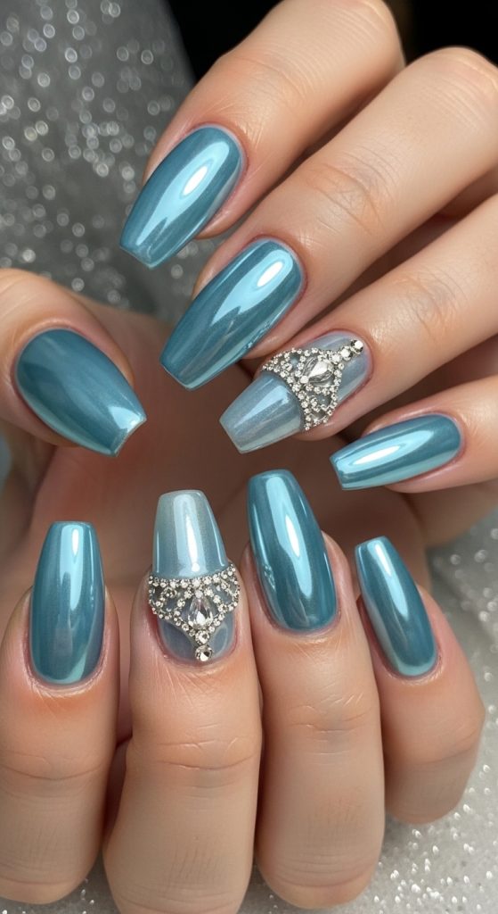 Nothing captures the Cinderella vibe better than soft royal blue chrome nails. This design features a cool-toned blue chrome powder layered over a gel base to create a reflective, glass-like finish. The nails shimmer under light, resembling Cinderella’s iconic ball gown.