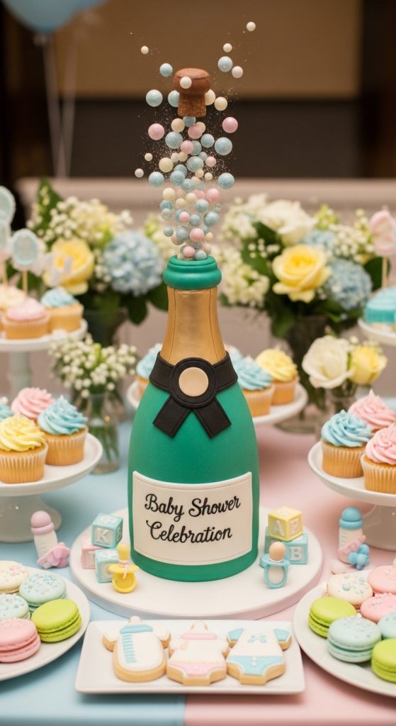 End the shower with a statement cake moment. A cake designed like a popping bottle or exploding bubbles fits the theme perfectly. Inside the cake, you could even reveal the baby’s gender with colored layers.