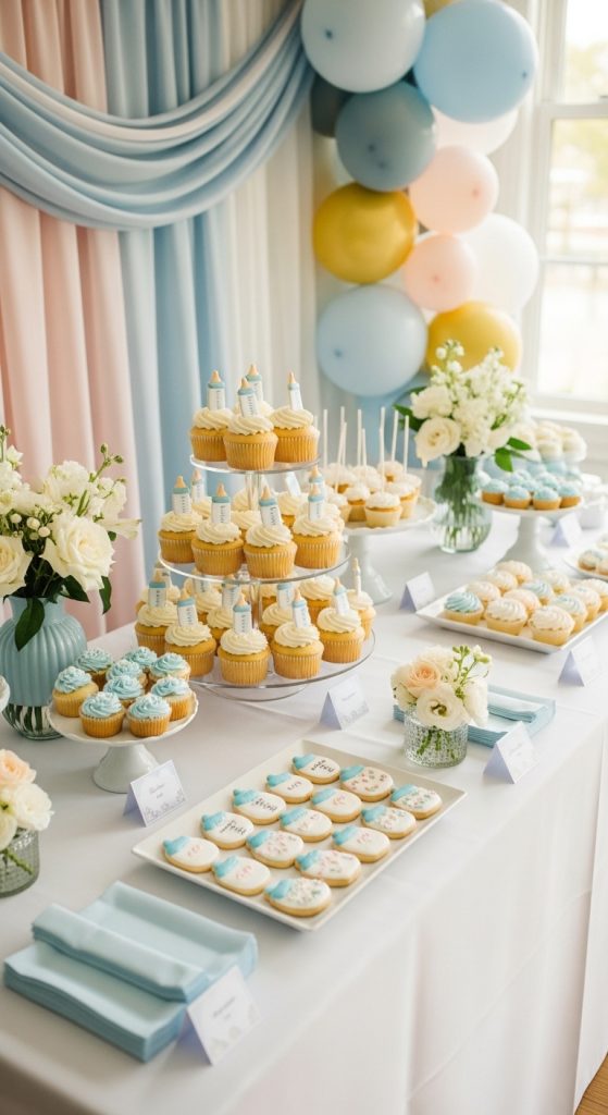 A themed dessert table can be the centerpiece of the event. Decorate the table with baby bottle props, confetti, pastel linens, and a stylish sign with the party theme.