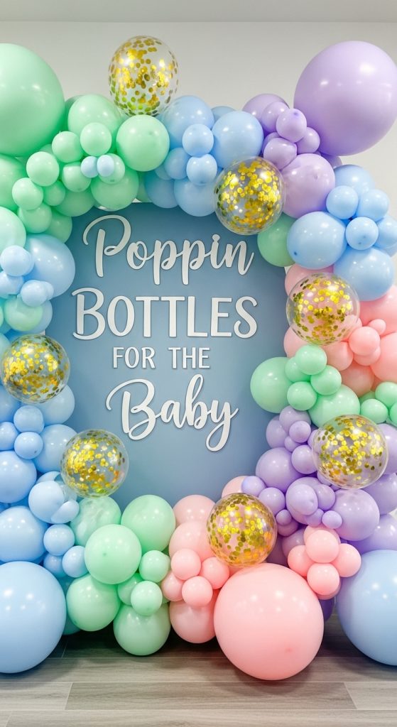 A balloon backdrop instantly sets the mood for the baby shower. Use a mix of pastel balloons, metallic balloons, and transparent balloons filled with confetti to create a festive wall behind the dessert or gift table. Adding bottle-shaped balloons or baby bottle foil balloons ties perfectly into the theme.