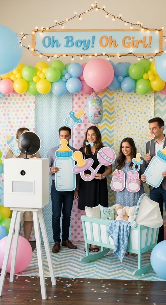 Provide props like baby bottles, funny signs, pacifiers, oversized sunglasses, and playful phrases like “Ready to Pop,” “Baby on the Way,” or “Sip Sip Hooray.” Guests will love sharing photos from the event.