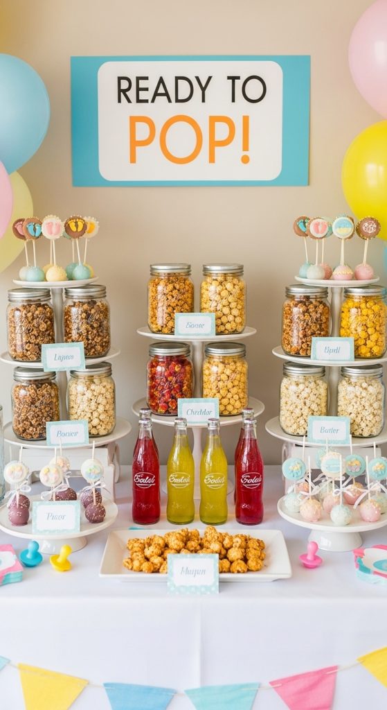 Food displays can also reflect the theme. Create a snack table labeled “Ready to Pop” featuring popcorn, cake pops, soda bottles, and bubbly drinks.