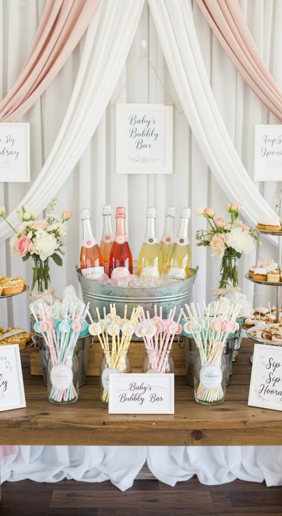 Decorate the bar with gold accents, glass drink dispensers, and signage such as “Poppin’ Bottles Bar” or “Baby Bubbly Station.” This adds a sophisticated touch while keeping the event family friendly.