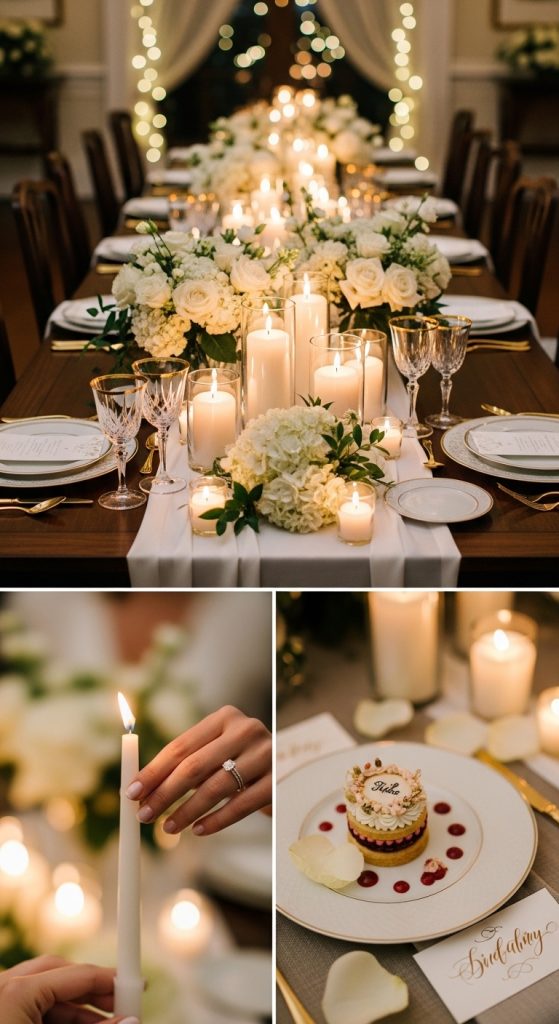 A candlelight engagement party creates an intimate and magical mood. Use candles of different heights, soft music, and elegant décor to set the tone. A formal dinner or dessert reception fits perfectly with this theme. Guests can share heartfelt messages, and the couple can give a meaningful thank-you speech to end the evening beautifully.