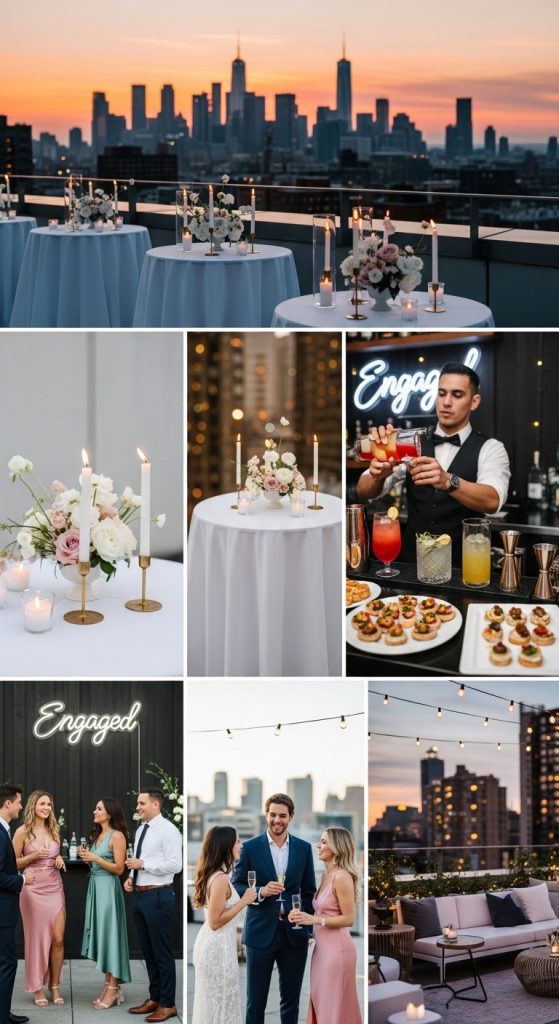 If you want something modern and stylish, a rooftop engagement party is a fantastic option. City views, sunset skies, and glowing lights create a magical setting. Use minimalist décor such as fairy lights, cocktail tables, and elegant centerpieces. A live DJ or acoustic performer can add energy to the evening. Signature cocktails named after the couple can also make the party feel personalized and fun.