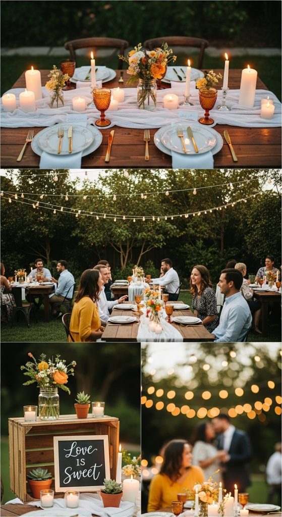 For couples who prefer intimate gatherings, a backyard dinner party is perfect. Arrange long tables with warm lighting, candles, and rustic decorations. Serve a curated menu with comfort foods or a family-style meal so guests can connect easily. Soft music, personal toasts, and storytelling about the couple add a heartfelt touch that guests will appreciate.