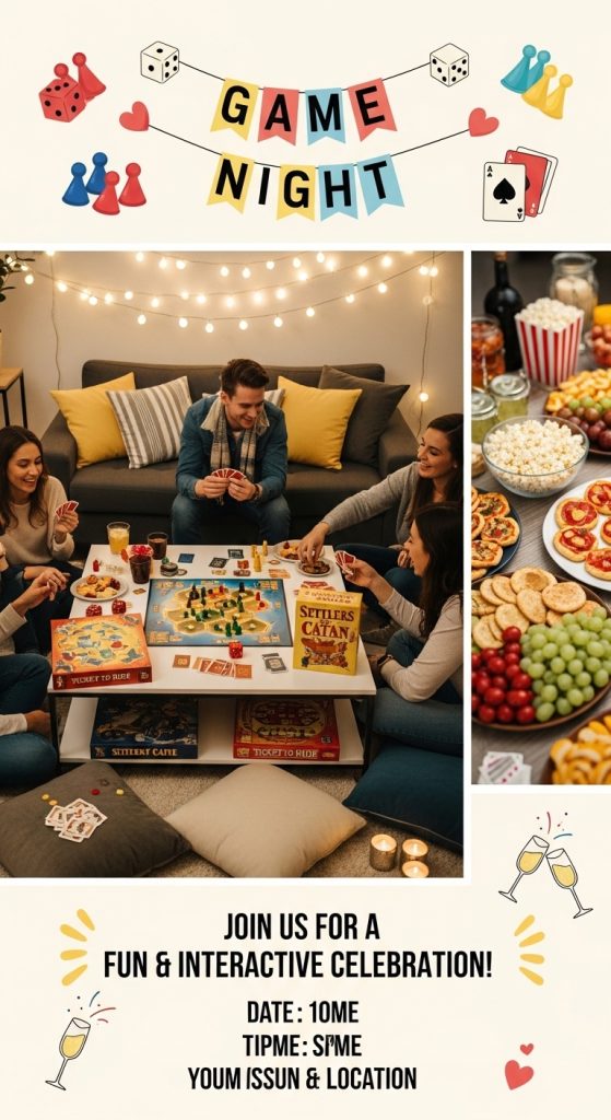 For a fun and interactive celebration, host a game night engagement party. Include board games, trivia about the couple, and friendly competitions. This idea is great for breaking the ice and keeping everyone entertained. Add snacks, a dessert bar, and comfortable seating so guests can relax while enjoying the activities.