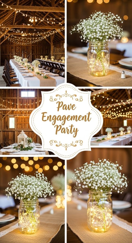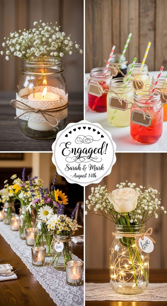 Use them as drink glasses, candle holders, flower vases, and even dessert containers. Tie twine, lace, or burlap around the jars to enhance the rustic look. You can also add small tags with the couple’s initials or engagement date.