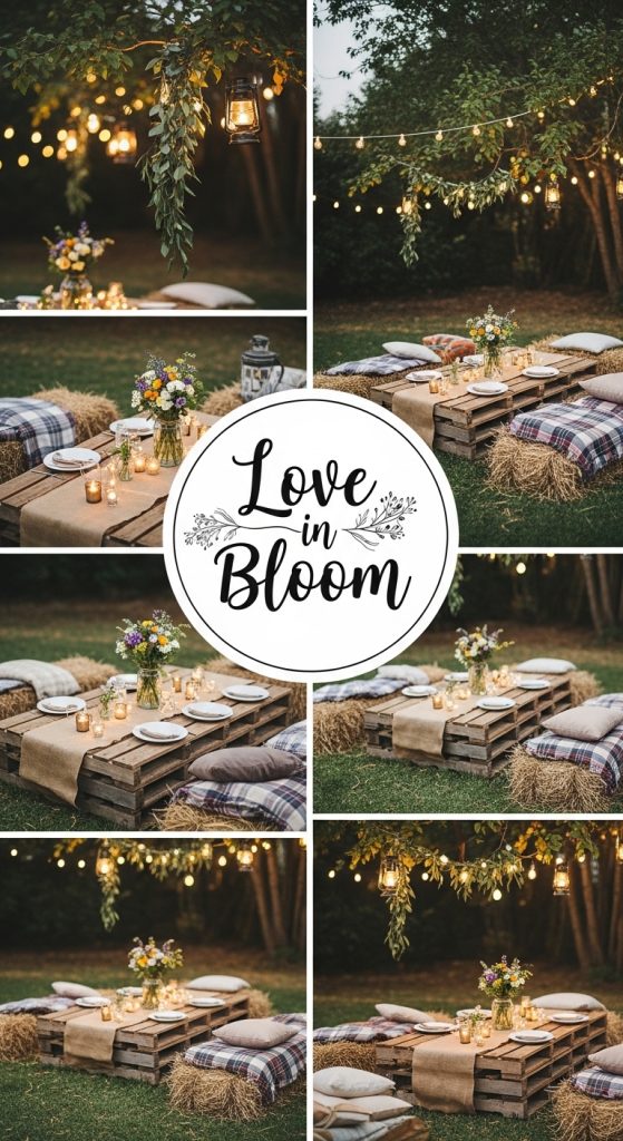 Use wooden pallets for tables, decorate with lanterns, and hang string lights across fences or trees. Add cozy seating areas using hay bales with blankets and cushions. A small bonfire area can also make the evening feel warm and intimate.