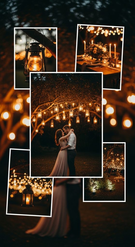 Hang warm string lights across trees, fences, and pergolas. Add lanterns along walkways and candles on tables. As evening arrives, the glowing lights transform the space into something magical.