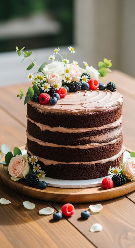 Fresh flowers, berries, and chocolate shavings create a natural aesthetic look. Wooden cake stands or linen table décor make it even more charming.