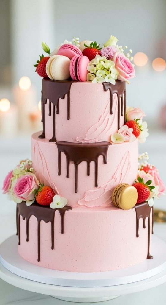 The top can be decorated with macarons, strawberries, chocolate shards, or small flowers. The drip design adds texture and makes the cake look professionally crafted.