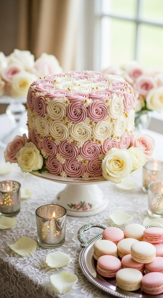Roses symbolize love, which makes them perfect for bridal celebrations. A romantic rose chocolate cake features piped buttercream roses covering the entire cake or cascading down one side.