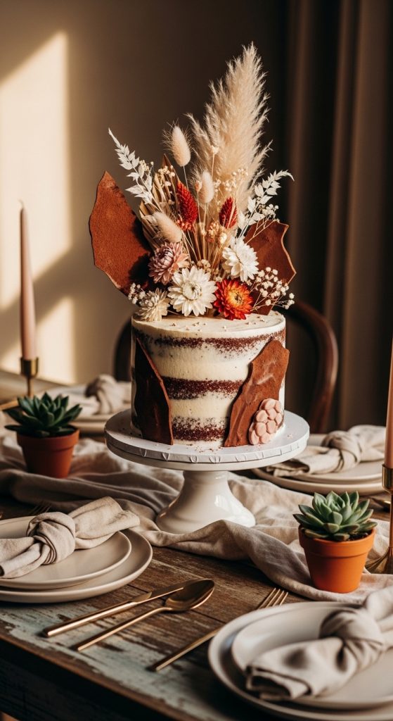 The cake might have semi-naked frosting showing the chocolate layers slightly. Decorations include dried flowers, pampas grass, figs, or chocolate shards.