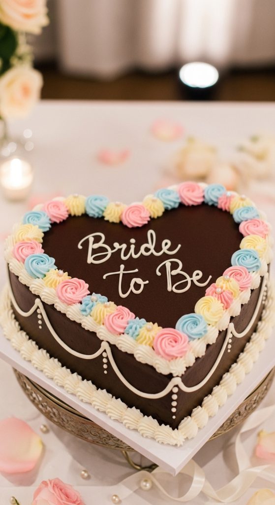 Piped borders, tiny pearls, and delicate writing like “Future Mrs.” or the bride’s name make the cake more personal.