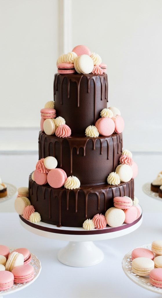 Soft shades like blush, ivory, lavender, or sage green macarons complement the chocolate base beautifully. Chocolate drips or buttercream swirls can be added for extra detail.