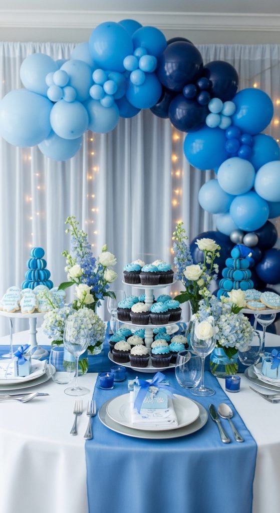 Create a dessert table filled with blue cupcakes, macarons, and candies. Add elegant blue ribbons, candles, and signage.