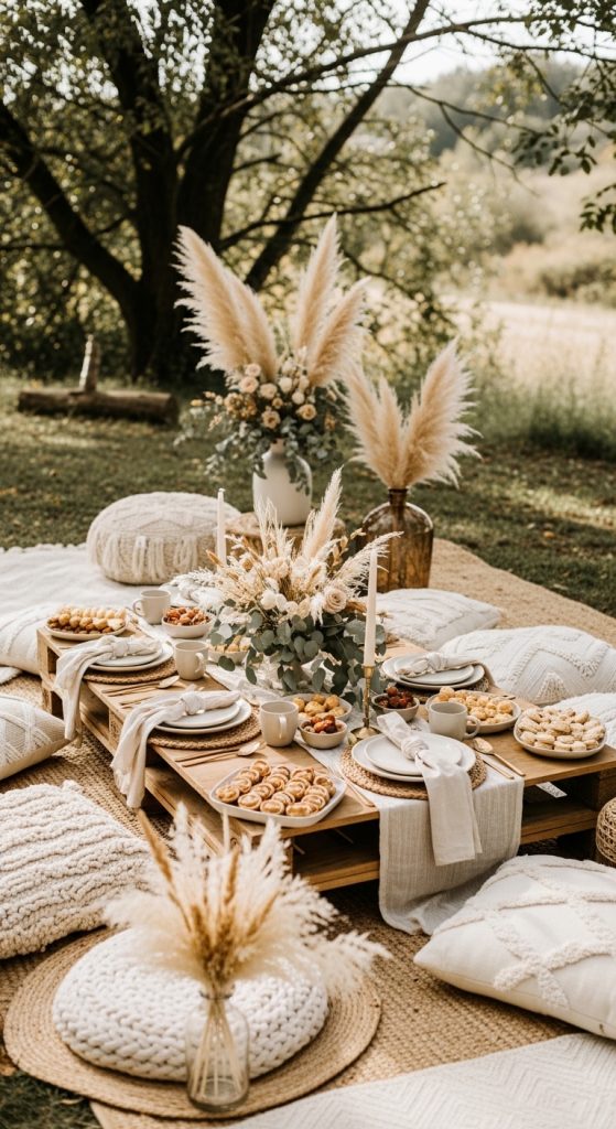 Low picnic-style seating with rugs and cushions adds a relaxed feel. String lights, lanterns, and dried flowers complete the aesthetic.